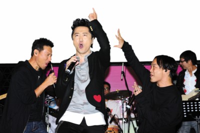 在昨日的發(fā)片會上,張學友和陳奕迅新老兩歌神不僅到場助陣,還帶來了庾澄慶最喜歡吃的巧克力和薯片,寓意他在香港“吃得開”。三人特別合唱了《愛你的只有一個我》、Rap版《愛是懷疑》以及搖滾版《吻別》。開唱前張學友打趣說:“情緒好點了嗎?”陳奕迅還特別提醒在座媒體“留心歌詞”。由于三人的表演非常精彩,有記者發(fā)問,庾澄慶是否考慮與張學友和陳奕迅組成一個類似“縱貫線”的樂隊,庾澄慶說:“你剛才看到的表演我們才排練了十分鐘,每一次他們都覺得哪里加一個和音會比較有亮點,在他們百忙之下一共合作了三次。我覺得我們?nèi)齻首先應該有作品,因為學友馬上就有專輯出來,Eason也正在錄音,把三個人放在一起表演有困難,如何協(xié)調(diào)才是真的,所以先有歌會比較好。我們?nèi)齻中,學友比較煽情,我比較搖滾,陳奕迅的發(fā)揮很即興,寫這首歌的人不一定是我,但是寫的人一定會很過癮。如果市場反應不錯的話,可以跟‘貫縱線’拼一下!