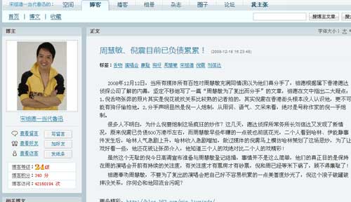 宋祖德在博客里面寫(xiě)道,他是從自己下屬某公司獲得該內(nèi)幕的,除了知道他們是在炒作外,還獲悉倪震已經(jīng)負(fù)債500萬(wàn)港幣。并炮轟倪震借鑒“伊能靜與庾澄慶婚變事件”策劃出這一起分手復(fù)合戲,其意是在保持周慧敏的關(guān)注度,以便提高周慧敏的演唱會(huì)票房牟利。田雯