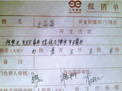 這份報(bào)銷(xiāo)單中,開(kāi)支內(nèi)容一欄寫(xiě)的是“陳楚生失蹤事件媒體及博客寫(xiě)手費(fèi)用”,部門(mén)負(fù)責(zé)人審核一欄簽有天娛傳媒宣傳總監(jiān)吳夢(mèng)知的名字,公司領(lǐng)導(dǎo)審批則有天娛總經(jīng)理龍丹妮和天娛副總楊柳的簽名。