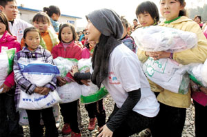 翁虹與丈夫是“中國社工協(xié)會(兒童希望)救助”的形象大使。上周,他們與志愿者們一起將棉衣、棉被等過冬物資送到四川省綿陽市一些災民手中,并提前跟孩子們過年。