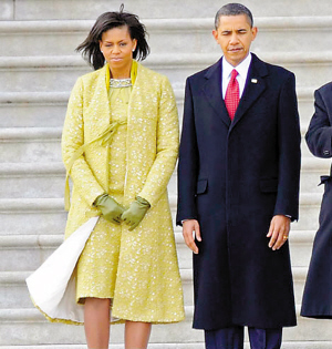 新任美國總統(tǒng)奧巴馬的妻子米歇爾在典禮上的穿著,時(shí)尚界評價(jià)不一,設(shè)計(jì)師托雷多說,黃色并非政治場合的傳統(tǒng)顏色,不過它傳達(dá)了希望與樂觀的意象。托雷多說,她是用瑞士羊毛蕾斯混法國絲的布料,裁制那套衣服,黃色代表陽光。