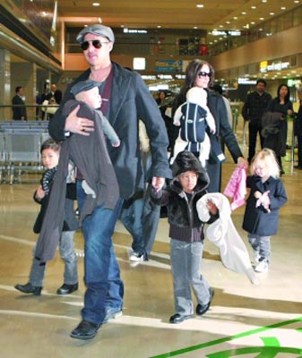 皮特和茱莉帶著6名子女到東京,分別宣傳兩人的新片《本杰明·巴頓奇事》和《換子疑云》,全家在機(jī)場獲禮遇快速完成通關(guān)。皮特胸前抱著諾克斯,左手牽著非洲裔養(yǎng)女扎哈拉,右手拉著越南養(yǎng)子帕克斯,率先入境,現(xiàn)場200多名“粉絲”瞬間陷入瘋狂,尖叫聲不斷。茱莉則是懷抱維維恩,牽著希洛與馬多克斯緊跟在后,她頻向左方護(hù)欄后的“粉絲”微笑致意,希洛看了有樣學(xué)樣,也轉(zhuǎn)身好奇地觀望群眾。馬多克斯與扎哈拉顯得心不在焉,倒是排行老二的帕克斯,似乎還不太習(xí)慣鏡頭與人群,他最后一個下飛機(jī),入境時頻頻舉手遮眼,甚至以衣服包頭閃避鎂光燈。