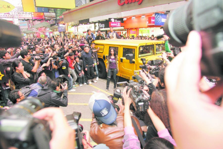 三月十一日,藝人不雅照女主角之一的鐘欣桐(阿嬌)復出后首次現(xiàn)身香港鬧市街頭,引來數(shù)百人圍觀,爭相拍攝。阿嬌復出后首份工作是擔任一個牛仔褲品牌的代言人,當日出席該品牌一分店的宣傳活動。 中新社發(fā) 黎金良 攝