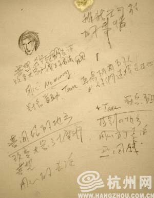 和所有的新聞發(fā)布會一樣,劉謙的新聞發(fā)布會也有冗長的各贊助商發(fā)言時間。從臺下看,劉謙在贊助商發(fā)言時間一直很認真地在記筆記,而事實上,他和每一個在無聊會議上的人一樣,認真地在紙上亂涂亂畫:一個小小的自畫頭像,幾行無意義的漢字,還有一處寫著“No money”,就是這位魔術(shù)師的會議筆記。