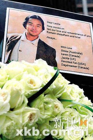 張國(guó)榮(哥哥)的歌迷昨天在香港文華東方酒店外舉行悼念活動(dòng),紀(jì)念哥哥去世六周年。事發(fā)地?cái)[滿歌迷自發(fā)送來(lái)的各式鮮花。3月31日上午11時(shí)開(kāi)始,便有歌迷從上海、臺(tái)北,日本、美加、英國(guó)、澳大利亞等地趕到文華東方酒店向偶像悼念,并送上心形花牌給哥哥。