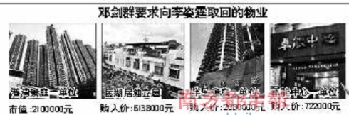 另外,有報道指,鄧劍群在向法院交待這些年交與李姿霆的多處物業(yè)時稱,當初以李姿霆的名義購買物業(yè)只是為怕兩人戀情會因他登記成為業(yè)主而被揭發(fā),但并沒有打算將物業(yè)以饋贈形式轉(zhuǎn)讓給李姿霆,如關(guān)系終結(jié),她持有的業(yè)權(quán)將悉數(shù)歸還給鄧劍群。