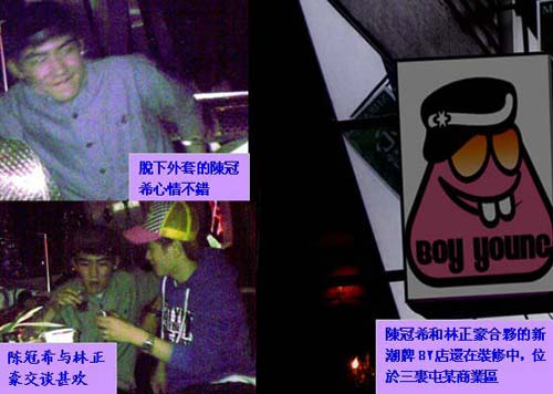 記者隨后跟出門口,卻不見陳冠希一行身影。而他們的奔馳座駕一直停在車位,約凌晨2時(shí)許,才見三名保衛(wèi)人員隨同之前陪著陳冠?瓷啼伒捻n國(guó)華裔富家林正豪出來,而后打開車門,拿了什么東西,而后又回到酒吧。記者注意到,該富商一直有保衛(wèi)人員跟隨,而且當(dāng)晚一直陪同陳冠希,看來關(guān)系非同一般。此外,記者輾轉(zhuǎn)從酒吧大堂經(jīng)理處了解到,與陳冠希同行的林正豪乃韓國(guó)上流社會(huì)頗有影響力的華人企業(yè)林氏株會(huì)社貴公子,早年一直玩轉(zhuǎn)韓國(guó)時(shí)尚圈,近年也當(dāng)歌手出唱片,可謂是橫跨時(shí)裝和娛樂兩界,不僅擁有韓國(guó)頂尖潮流服裝品牌,還是韓國(guó)某娛樂公司的幕后老板,而當(dāng)晚夜店老板早就安排了陳冠希一行到來的保衛(wèi)工作。大堂經(jīng)理透露,這位韓國(guó)華裔富家林正豪也是他們老板的好朋友,此行除了陳冠希外,還有京城某地產(chǎn)商之女以及圈內(nèi)某著名女制片人之子,“身家都是上億的。”