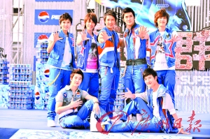 昨日,人氣組合Super Junior-M在中國香港出席代言百事簽約儀式(見上圖),在形式上搞搞新意思坐著推土機出場,散發(fā)著陽光氣息,身為Super Junior-M隊長的韓庚更表示,希望可以借現(xiàn)在專輯發(fā)布、人氣上升的時機,向影視方面進軍。