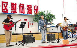 得知“心連心”前來演出,不大的擂鼓鎮(zhèn)廣場擠滿了 5000多名從四處趕來的北川人。上午9時(shí),在導(dǎo)演兼主持人馬東的“吆喝”中,央視名嘴王小丫、張澤群、董浩、撒貝寧、韓喬生樂一一亮相,分別為災(zāi)區(qū)人民送上一句祝福。而最難得的場面是平時(shí)說比唱多的央視名嘴齊秀唱功。不過最搞笑的當(dāng)屬“韓大嘴”,他一發(fā)聲,調(diào)不知跑哪兒去了,頓時(shí)笑翻全場。接下來,鞠萍、趙保樂的《為了誰》,郭峰演唱的《勝利》,孫悅等人演唱的《好人好夢(mèng)》和觀眾進(jìn)行了臺(tái)上臺(tái)下的熱烈互動(dòng),把現(xiàn)場氣氛推向高潮。