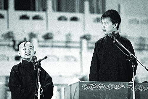 昨晚演出前大會(huì)堂門口的黃牛黨多數(shù)都在收票,演出開場(chǎng)后原價(jià)票依然還有人肯買。演出舞臺(tái)裝飾成天壇的樣子,讓北京觀眾感到相當(dāng)親切。郭德綱兒子郭麒麟和義子陶陽開場(chǎng)就說了《學(xué)雜唱》,這個(gè)段子主要表現(xiàn)演員對(duì)各種戲曲唱段掌握程度,比相聲臺(tái)高一點(diǎn)點(diǎn)的郭麒麟不僅將梅葆玖、袁世海等名角唱腔模仿得很像,而且現(xiàn)場(chǎng)還唱起了流行歌曲,此外口才也相當(dāng)了得,不少觀眾感嘆“還是有郭德綱的遺傳基因,天賦不俗。”