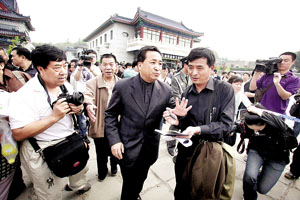 9點10分左右,常寶華、劉惠等人紛紛從側門離開,被群眾和媒體以包夾之勢分別圍住。