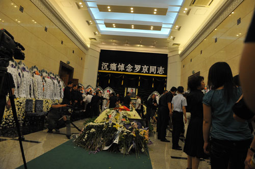 靈堂內(nèi)布置一新,羅京安靜的躺在棺木中央,身蓋黨旗,周身鮮花簇?fù)。一身深色西服配彩色領(lǐng)帶,面色白皙自然,與平日在主播臺(tái)上見到的“冷面”相比,多一絲溫暖。