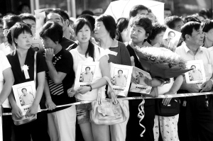 大約在9:30,有一些老人開始體力不支,為了避免更多人中暑,治喪委員會(huì)決定提前允許公眾入場(chǎng),群眾開始自發(fā)組織排隊(duì),隊(duì)伍從東大廳門口排起,一直到公墓西門,然后彎折向南,到達(dá)南門,據(jù)記者目測(cè),大約有1000米長。大部分群眾都是靜靜等候,隊(duì)伍井然有序。而公眾進(jìn)入告別室后,為了節(jié)約時(shí)間,不鞠躬不與家屬握手,只是瞻仰遺容后立即離開。