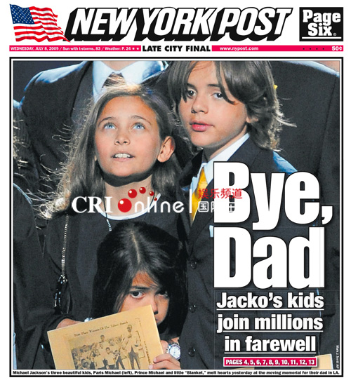 2009年7月9日訊,洛杉磯,當(dāng)?shù)貢r(shí)間7月7日,流行音樂之王邁克爾·杰克遜(Michael Jackson)的公眾悼念儀式在美國洛杉磯的斯臺普斯體育中心舉行。當(dāng)?shù)貢r(shí)間7月8日,《紐約郵報(bào)》把杰克遜三遺孤的合影當(dāng)做封面,孩子們泛紅的眼圈,哀傷的神情令人心酸。