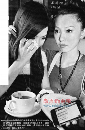 據(jù)香港周刊報(bào)道,有目擊者稱見(jiàn)到22歲的口靚模A nnabella(羅靖希)和好姐妹A sa(關(guān)紫藍(lán))進(jìn)入灣仔某酒店,疑似陪客吃飯。當(dāng)港媒向A nnabella求證此事時(shí),她激動(dòng)否認(rèn)傳聞稱自己沒(méi)有去過(guò)“不三不四”的飯局。A nnabella表示的確收到過(guò)淫媒的短信,但未答應(yīng)“我們敢發(fā)誓沒(méi)有做過(guò)(飯局陪客),也沒(méi)有給他們電話”,淫媒因此還發(fā)信息罵她:“不要再純情扮潔身自愛(ài)了!”為證明清白,她還公開(kāi)淫媒發(fā)來(lái)的短信,內(nèi)容包括“今晚灣仔道N ight Club有客6000快覆”、“請(qǐng)覆機(jī)去不去,加到一萬(wàn)上房”等等。
