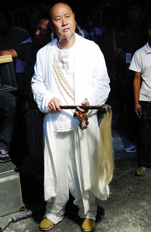 造型:一身白袍,加上白頭發(fā)白胡子,再掛一串菩提子,這個意境十足的裝扮只需花五分鐘———此乃現(xiàn)場記者親自驗證。劉鎮(zhèn)偉為人寬容,記者湊著他猛拍也不介意,還叫化妝師把簾子拉開,別把大家熱壞了。