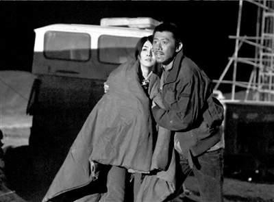 前晚,《西風(fēng)烈》在祁連山腳下的一個(gè)礦石場(chǎng)拍攝夜戲。從敦煌市區(qū)到拍攝地,一路荒漠。在深夜接近零度的氣溫下,高群書(shū)執(zhí)導(dǎo)拍攝了一場(chǎng)吳鎮(zhèn)宇焚燒押解警察和亡命鴛鴦所在的帳篷,想把他們?nèi)繜赖膽蚍荨?