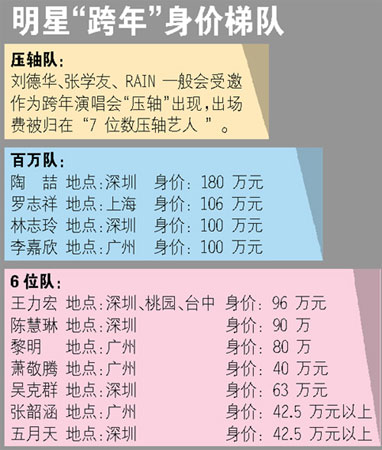 由于圣誕和元旦雙節(jié)即將到來,港臺(tái)和內(nèi)地明星馬上又要迎來一年一度的搶錢“尖峰時(shí)刻”。往年,臺(tái)灣地區(qū)的明星基本以島內(nèi)“串場”為主, 元旦除夕晚從臺(tái)北一路南下,一個(gè)晚上坐飛機(jī)或直升機(jī)趕場賺錢。但今年起,大陸各大衛(wèi)視的跨年演唱會(huì)“搶星大戰(zhàn)”升級,為港臺(tái)明星大開“錢”途。僅北京、上海、廣州、深圳等幾大城市舉辦的跨年秀已讓港臺(tái)明星跑到腳軟,且這些電視臺(tái)開出的價(jià)格大大高出臺(tái)灣或者香港同樣活動(dòng)的報(bào)價(jià),因此內(nèi)地地區(qū)的跨年活動(dòng)明顯更有吸引力。