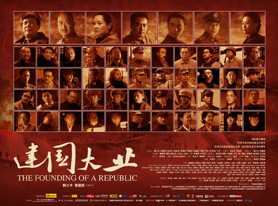 中新網(wǎng)9月4日電 國(guó)慶獻(xiàn)禮大片《建國(guó)大業(yè)》的最新四款海報(bào)日前公開(kāi)。廣州日?qǐng)?bào)報(bào)道說(shuō),《建國(guó)大業(yè)》共有172位明星加盟,平均每3分鐘就能看到一張熟悉的明星臉,其中大部分都是露一露臉就走的“龍?zhí)住。?bào)道質(zhì)疑,這么多明星參與完成的一部電影,可能是“群英薈萃”,也可能變成“蘿卜開(kāi)會(huì)”。