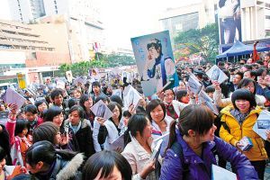 從早上8點開始,沙坪壩重慶書城前就開始有郭敬明的粉絲前來。一位15歲的女孩告訴記者,她是早上9點鐘到的,中途吃飯時花10塊錢雇了個棒棒幫忙排隊,其余時間都站在這里。女孩的媽媽也陪同前來,但比女兒害羞,不愿意接受采訪,不停地擋住自己的臉讓記者不要拍她。女兒卻很踴躍:“我們?nèi)叶际切∷牡姆劢z,但我爸爸覺得男娃兒來不好,才沒有來。”而現(xiàn)場大多數(shù)都是十幾歲的女孩,記者4點半到達時已經(jīng)聚集了近千人,把沙坪壩重慶書城門口圍得水泄不通。