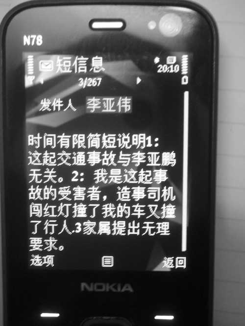昨天,李亞偉接受了本報(bào)記者的采訪,針對(duì)“車(chē)禍門(mén)”事件,他給記者發(fā)來(lái)短信表明態(tài)度——1:這起交通事故與李亞鵬無(wú)關(guān)。2:我是這起事故的受害者,造事(應(yīng)為肇事)司機(jī)闖紅燈撞了我的車(chē)又撞了行人。3:家屬提出無(wú)理要求。