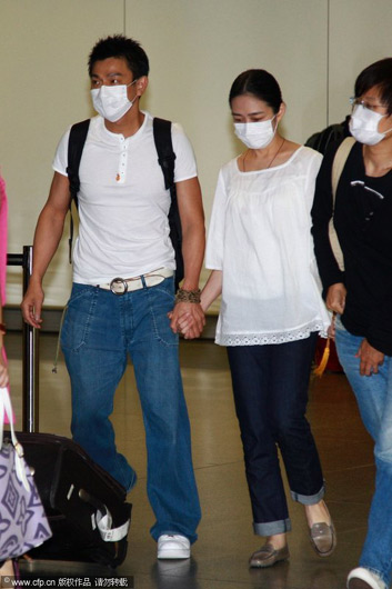劉德華和朱麗倩兩人一樣身穿白色上衣和藍色褲子戴著口罩,身上并掛著朱家兒女在朱父出殯時的佛珠項煉,十指緊扣步入機場登機門。