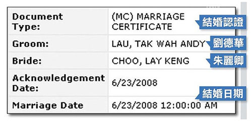 從美國內(nèi)華達(dá)州克拉克郡的公共搜尋網(wǎng)站可以發(fā)現(xiàn)一筆數(shù)據(jù),疑似就是兩人的結(jié)婚證據(jù),或許也是讓華仔留言道歉的關(guān)鍵原因。Lau Tak Wah Andy就是劉德華粵語發(fā)音的英文名字,而Choo Lay Keng分析就是朱麗倩本名朱麗卿的英文名字。從這份數(shù)據(jù)可以發(fā)現(xiàn),兩人在去年6月23日,于賭城拉斯韋加斯注冊結(jié)婚,至于結(jié)婚通知與注冊日期都是同一天,兩人有可能是即興結(jié)婚。