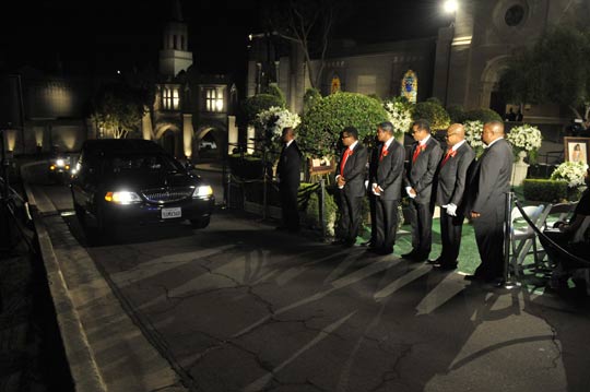 臺灣TVBS消息,白色的鮮花將杰克遜的葬禮布置得莊嚴(yán)素雅,棺木旁還有一幅杰克遜的畫像。包括玉婆伊麗莎白.泰勒,還有麥考利.金都紛紛出席,要送杰克遜最后一程,但是杰克遜的家人卻延遲了1個(gè)多小時(shí)才出現(xiàn),也讓原本要在北京時(shí)間10點(diǎn)舉行的葬禮,一直到11點(diǎn)才開始。