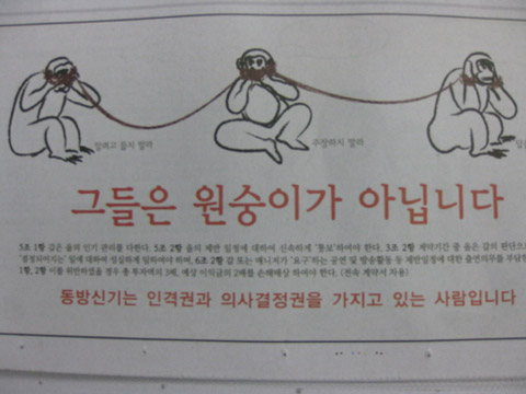 9月10日,歌迷登出的廣告援引了組合和SM間專屬合同的部分內(nèi)容,把東方神起成員比喻成被遮住口眼的猴子,諷刺了合同的不公平性。還用了(以SM的口氣)“別想知道太多”、“別提主張”和“別期待有什么答案”等廣告語進行了尖刻的批評。