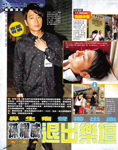 原本10月出唱片的孫耀威,上月忽然向所屬的環(huán)球唱片公司以聲帶不適為由,要求無限期押后錄音,并推掉一連串登臺工作。據(jù)知半年前,孫耀威發(fā)現(xiàn)每次表演后喉嚨便出現(xiàn)劇痛和紅腫,起初他以為是一般歌手常有的聲帶發(fā)炎,于是便戒酒救聲,但一直沒有好轉(zhuǎn),最近才被醫(yī)生證實是聲帶出血,每次唱歌都會引發(fā)聲帶微血管爆裂,喉嚨充血。聲帶出血將孫耀威的事業(yè)計劃全盤打亂,他原本計劃明年在臺灣出碟,如今都因病泡湯。