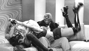上周六播出最新一集SNL,年過(guò)半百的娜姐跟比她年輕一半的Lady Gaga,兩人穿著皮制內(nèi)衣及長(zhǎng)靴勁歌熱舞,娜姐先是挑釁地說(shuō):“跳得什么爛鬼迪斯科啊!盠ady Gaga回嘴:“麥當(dāng)娜,我比你更辣!蹦冉悴桓适救醯卣f(shuō):“我比你高,Lady Gaga這什么名字啊,聽(tīng)起來(lái)像嬰兒食品!彪S后兩人扭打,主持人凱南·湯普森唯有出來(lái)調(diào)停,最后Lady Gaga干脆整個(gè)人飛撲過(guò)去,跨過(guò)凱南直接打娜姐。凱南正在發(fā)愁之際,兩位“瘋后”突然和好了,而且還當(dāng)眾親嘴。事后兩人表示互相當(dāng)對(duì)方為偶像,感情好得很。泰漁