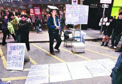 日前,在旺角行人專用區(qū),一位中年男子在頭上圍上“我愛容祖兒公主”的紙牌,帶著紅白藍膠袋、兩張折椅等做道具,當街展示多張求愛紙牌。