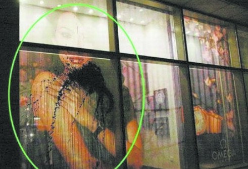 張曼玉沒來,章子怡也只是外出吃飯。正當(dāng)記者們準(zhǔn)備收工時,又一件意外的事情發(fā)生了。23點(diǎn),一輛黑色奧迪Q 7在酒店門口停了下來,隨后四五個身穿迷彩服、戴著墨鏡的男子從車?yán)镒呦聛磉M(jìn)入酒店大堂詢問保安:“章子怡住幾層?”看到保安未予理會,這幾個人立刻站在酒店大堂內(nèi),用東北話高喊:“大傻X!騙人錢!勾引人老公!”而大約半小時后,這輛車又回到了酒店門前。這次車上下來兩個身穿套頭衫的男子,手里拿著墨汁,走到酒店東側(cè)一間章子怡代言的鉑金店門前,沖櫥窗里的章子怡海報將墨汁潑了上去(見上圖)。隨后,兩人上車,Q 7拉著警報揚(yáng)長而去。