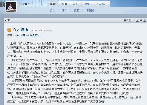 中新網(wǎng)12月29日電 曾因“間諜門”一事淡出熒屏的央視主持人方靜,上周再次出現(xiàn)在CCTV10《綠色空間》節(jié)目中,昨日(28日),方靜在博客中袒露心聲,表示自己在“間諜門”后一直在家寫歌療傷,更與大家分享自己創(chuàng)作的《心之歸所》這首歌。