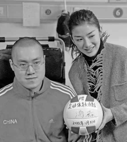 為了感謝黃奕,湯淼執(zhí)意要贈(zèng)送她一個(gè)親筆簽名的排球。黃奕拿著排球,湯淼左手握著筆,憑著前臂的力量用左手在排球上吃力地簽上了自己的名字。