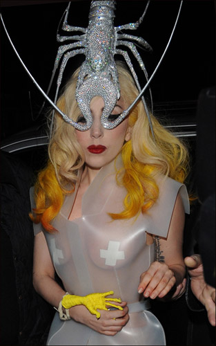 中新網(wǎng)3月2日電 “百變天后”Lady Gaga剛完成一連兩場倫敦演唱會,有傳上周五首場表演因超時45分鐘而遭場館罰款19,000美元,卻沒有阻她第二天到倫敦著名高級中菜館舉行慶功宴的興致,為了配合餐廳氣氛,她竟想到把一只銀色龍蝦放上頭當(dāng)帽戴,不知同去就餐的美國搖滾歌手Bruce Springsteen是否已經(jīng)見怪不怪。