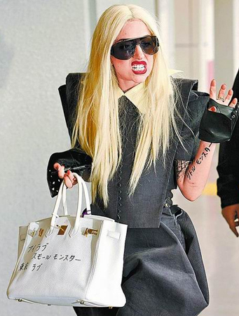 報(bào)道描述,Lady Gaga手跨柏金包,用日語(yǔ)寫著“我愛(ài)小怪物,我愛(ài)東京”,不知是不是要討好日本歌迷。
