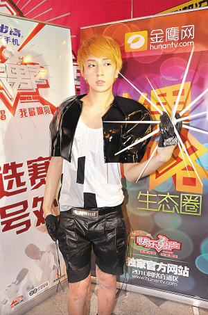 前天下午,快男成都唱區(qū)來(lái)了一位戴著墨鏡、身穿盔甲的選手報(bào)名,其雷人的造型立即引來(lái)眾人圍觀。在填寫報(bào)名資料時(shí),工作人員才發(fā)現(xiàn)原來(lái)這位個(gè)性選手就是2007年火爆全國(guó)的型秀冠軍師洋。三年不見,師洋的裝扮和舉止雷人依舊,而當(dāng)天的盔甲造型也讓他看上去更有霸氣。