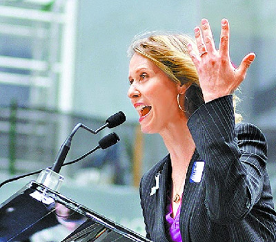 辛西亞3年前罹患乳癌,女友不離不棄陪她對抗病魔。她前天在記者會上公布訂婚喜訊,她說:“如果同志婚姻在紐約合法,我們一定會結(jié)婚。我不想假裝結(jié)婚,我們要真正的、合法的,能夠得到州政府認(rèn)可的婚姻!毙廖鱽喌暮糜选队鞘小分械摹跋木G蒂”克里斯廷·戴維斯,前天現(xiàn)身力挺她。