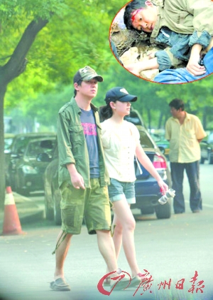 為了不讓外人認出,潘粵明與董潔都將帽檐壓得很低,兩人十分悠閑地邊走邊聊。從行走狀態(tài)上看,潘粵明已能行走自如,只是步履比較緩慢,董潔顯得比較緊張,還不時看看潘粵明臉上是否有不適的感覺。當(dāng)天董潔的左手中握著一卷褐色的物品,很像是醫(yī)用繃帶之類的東西,看樣子是為潘粵明準備的。