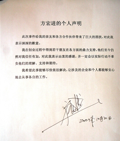 方宏進(jìn)的聲明字?jǐn)?shù)并不多,全文為打印字體,在文末空白處,方宏進(jìn)簽上了自己的名字。一開(kāi)頭,方宏進(jìn)就道歉,“此次事件給我的親友和各方合作伙伴帶來(lái)了巨大的困擾,對(duì)此我表示深深的歉意。”飽受爭(zhēng)議的方宏進(jìn)直言:“希望此事能夠盡快依法解決,讓涉及的企業(yè)和個(gè)人都能夠安心地從事各自的工作。”