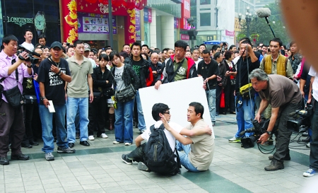 上午10點(diǎn)10分,記者趕到現(xiàn)場(chǎng)時(shí),解放碑下已經(jīng)聚集了數(shù)百群眾,不少人正在熱烈討論:“費(fèi)力抓到個(gè)小偷,結(jié)果是在拍戲嗦!痹瓉(lái),昨天的戲份是扮演張國(guó)立舞蹈老師的韓雨芹正在逛街,錢包被小偷偷了,“暗戀”老師的張國(guó)立發(fā)現(xiàn)后,奮勇抓住了小偷。一位工作人員告訴記者,一開始拍攝的是遠(yuǎn)景,出場(chǎng)的是身著張國(guó)立同樣服裝的替身演員,為求真實(shí),攝影機(jī)和工作人員都離得比較遠(yuǎn),現(xiàn)場(chǎng)非常不好控制。記者看到,每當(dāng)替身演員大喊抓小偷時(shí),本該由扮演路人的演員出場(chǎng)一起圍抓小偷,誰(shuí)知總有不少路人以為真有“小偷”,上百人一擁而上,還有的出手打“小偷”,導(dǎo)演不得不數(shù)次叫停,最后連張國(guó)立都上前來(lái)營(yíng)救“小偷”。