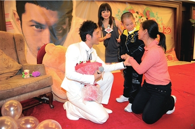 昨天,黃曉明的粉絲在京為他舉辦了一場名為“你在我心上”的慶生會。一個曾在福州受到黃曉明資助的聾啞小朋友金榕燊在母親的陪同下到場。金媽媽激動地拉著孩子跪謝黃曉明,場面溫馨感人。