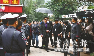 昨日下午2點(diǎn),孫紅雷秘密潛入重慶,在沒有任何預(yù)兆的情況下,出現(xiàn)在了江北步行街某品牌手表的新店剪彩儀式上。雖然主辦方非常低調(diào),但孫紅雷出場(chǎng)卻很高調(diào)。一身黑衣裝束,不下雨也有專人撐傘,沒太陽也戴著墨鏡。在上千人的圍觀中亮相10分鐘后飄然而去。