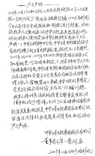 4,對(duì)于有關(guān)媒體沒有經(jīng)過核實(shí)發(fā)表“虛假報(bào)道”,中華衛(wèi)星電視集團(tuán)有限公司保留通過法律程序追究其法律責(zé)任的權(quán)利。