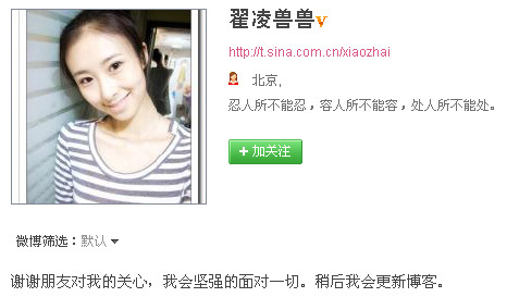 翟凌在微博中寫道:“謝謝朋友對(duì)我的關(guān)心,我會(huì)堅(jiān)強(qiáng)的面對(duì)一切。稍后我會(huì)更新博客。”