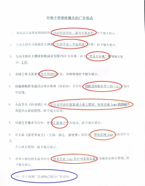 在清單里能看到的部分內(nèi)容包括,“現(xiàn)場嘉賓桌擺放贊助飲料娃哈哈飲用水、蒙牛牛乳飲料,給予鏡頭展示”;“互動(dòng)主持臺(tái)立面設(shè)計(jì)上體現(xiàn)‘中國平安·平安中國’字樣,給予鏡頭展示”;“春晚工作人員穿著喬丹贊助的服裝,春晚現(xiàn)場給予鏡頭展示”;“佳能相機(jī)作為道具出現(xiàn)在歌舞《拍拍拍》節(jié)目中,相機(jī)及相機(jī)掛帶上的logo在鏡頭中出現(xiàn)”;“小品節(jié)目《50塊錢》中,魯花食用油在面案或小桌上擺放,貼有企業(yè)Logo的圍裙作為道具由演員使用,給予鏡頭展現(xiàn)”;“劉謙近景魔術(shù)節(jié)目中,使用匯源果汁作為道具,給予鏡頭展示”;“趙本山演出的小品節(jié)目中帶有企業(yè)的logo的瀘州老窖禮盒作為道具由演員使用,給予鏡頭展示。”