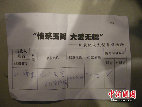 中新網(wǎng)4約0日電 今晚(4月20日)8時(shí),《情系玉樹,大愛(ài)無(wú)疆——抗震救災(zāi)大型募捐活動(dòng)特別節(jié)目》將在中央電視臺(tái)1號(hào)演播大廳舉行。過(guò)百演藝明星參與,在今天下午的排練現(xiàn)場(chǎng),孫楠成為最早一批到達(dá)現(xiàn)場(chǎng)的歌手,并在第一時(shí)間捐出30萬(wàn)現(xiàn)金,向?yàn)?zāi)區(qū)人民做出一份善舉。