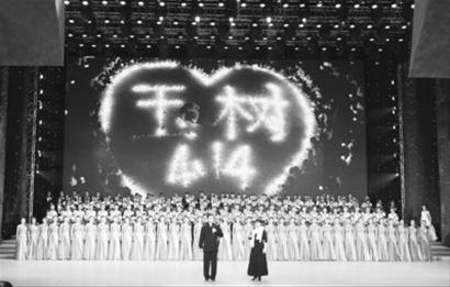 昨晚的《情系玉樹,大愛無疆——抗震救災(zāi)募捐活動特別節(jié)目》賑災(zāi)晚會,以新聞事件為主線,串起文藝演出和募捐活動。晚會按照時間的順序,穿插回放地震發(fā)生后的救援大事記,救援中的感人故事以及來自震區(qū)的報道,均出現(xiàn)在募捐現(xiàn)場。晚會一開始,在主持人白巖松的呼吁下,現(xiàn)場全體人士集體默哀三分鐘,隨后由百余位文體、曲藝界明星演唱了《我們眾志成城》,王菲、那英等明星領(lǐng)唱。