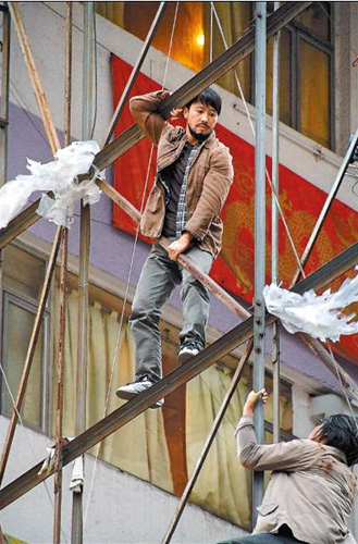 臺灣媒體消息,黎明前天在銅鑼灣鬧市區(qū)拍攝一場驚險追逐的戲,現(xiàn)場只見黎明在5層樓高的鷹架上爬來爬去,看得叫人為他捏把冷汗。